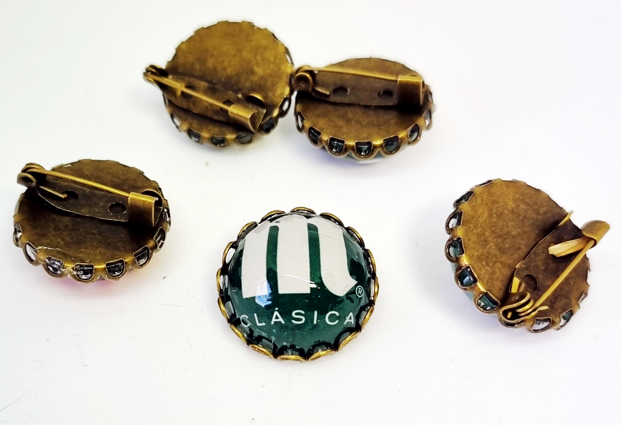 Значок английской булавки медного цвета, изготовленный с использованием вторичной переработки изогнутого значка пива Mahou Clásica.