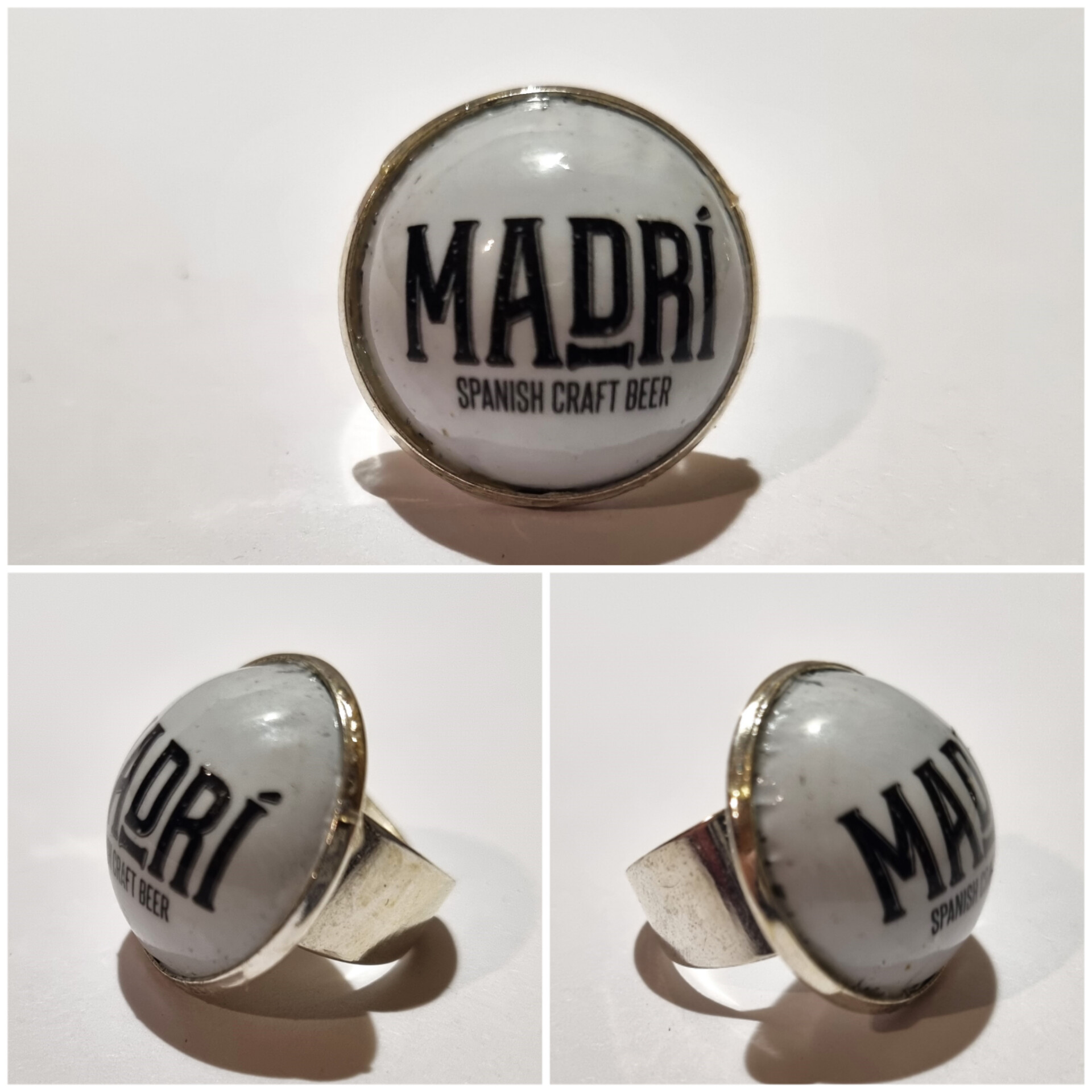 Регулируемое кольцо размера XXL (сфера 25 мм) из нержавеющей стали, выполненное из тарелки для сбора испанского крафтового пива Madrí. Покрыть лаком, чтобы изделие блестело и не царапалось.
