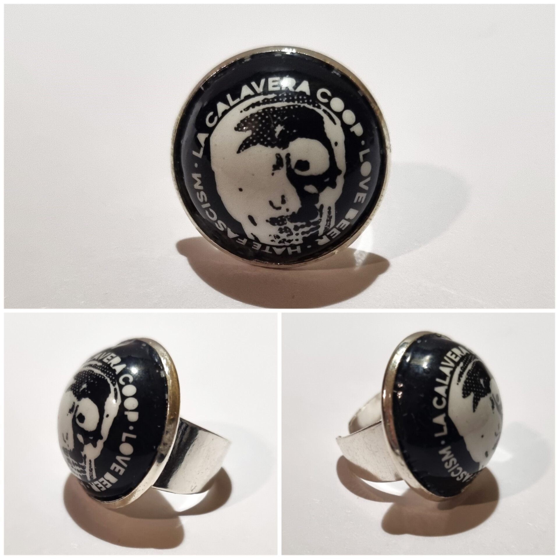 Регулируемое кольцо размера XXL (сфера 25 мм) из нержавеющей стали с пластиной для сбора мусора La Calavera Coop. Покрыть лаком, чтобы изделие блестело и не царапалось.
