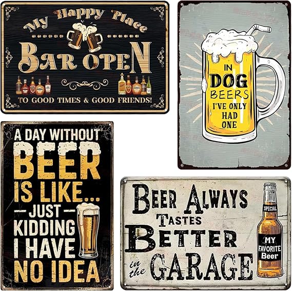 Bierschilder für Hausbar – 4 Stück, Bar-Zubehör, Vintage-Heimdekoration, lustige Metall-Wandschilder, Blechmann-Zubehör, Vintage-Dekoration für Schlafzimmer, Pub, Outdoor, Tiki-Wand, Bier