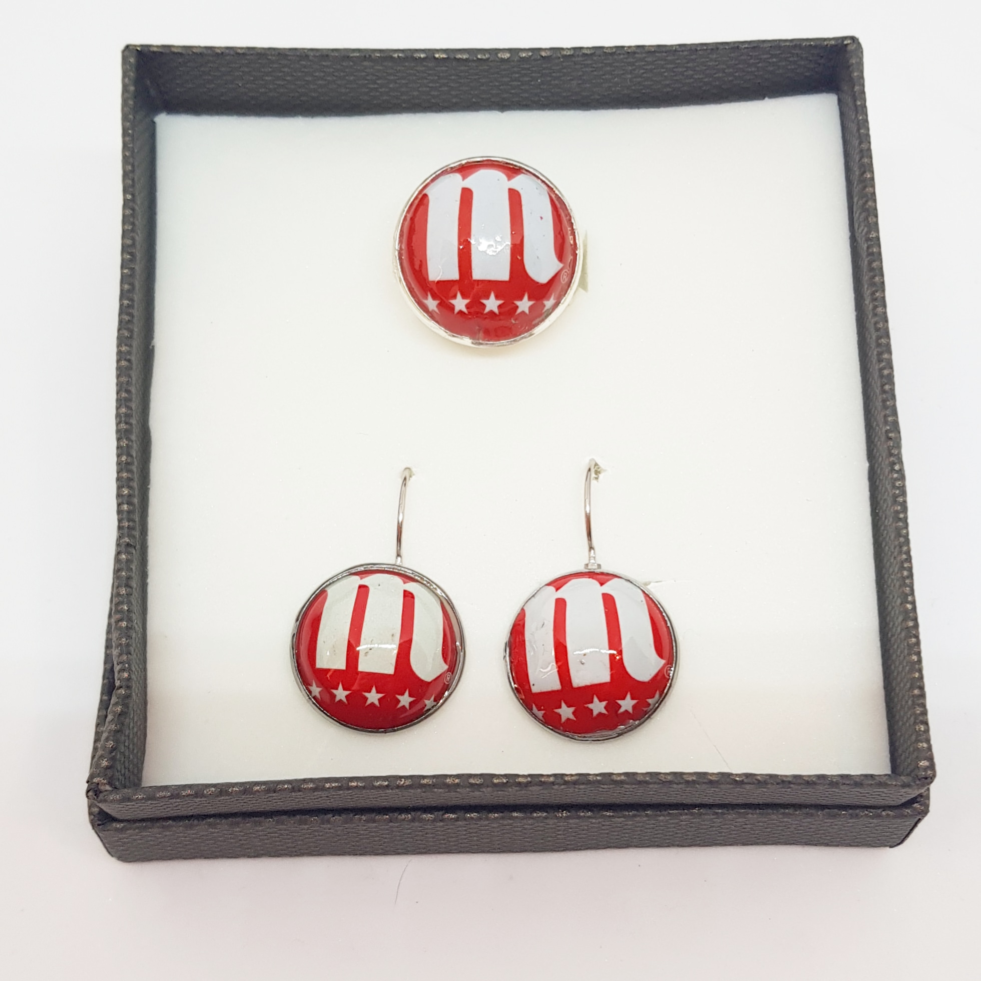 Набор из регулируемого кольца и сережек из нержавеющей стали, изготовленных вручную с элементами вторичной переработки, со значком пива Mahou Cinco Estrellas. Яркая и кристальная отделка, выполненная смесью лаков, благодаря чему изделие блестит и не царапается. Таким образом, он прослужит вечно, не потеряв рисунок листового металла.