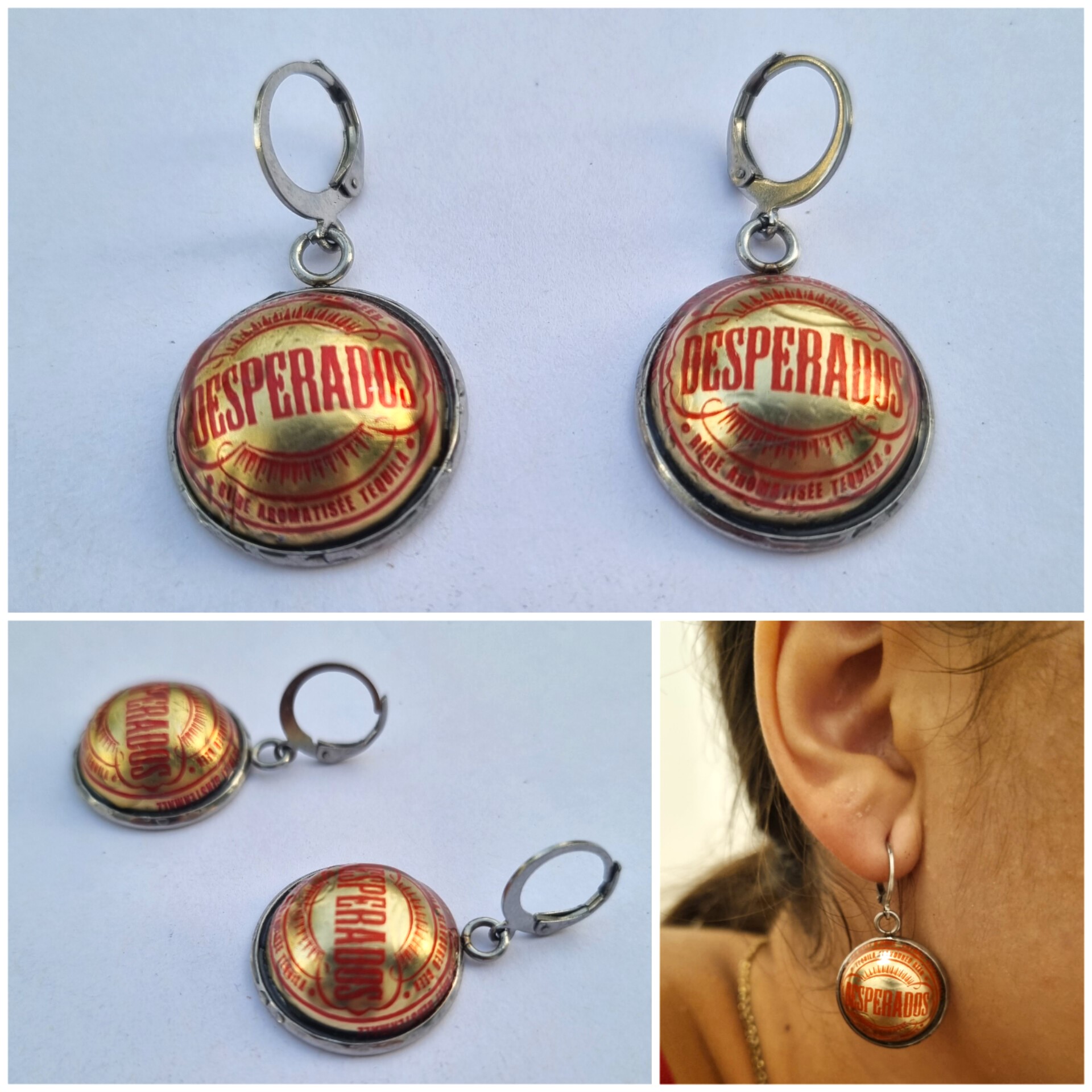 Серьги из нержавеющей стали, изготовленные вручную с оттенком вторичной переработки, со значками пива Desperados. Яркая и кристальная отделка, выполненная смесью лаков, благодаря чему изделие блестит и не царапается. Таким образом, он прослужит вечно, не потеряв рисунок листового металла.