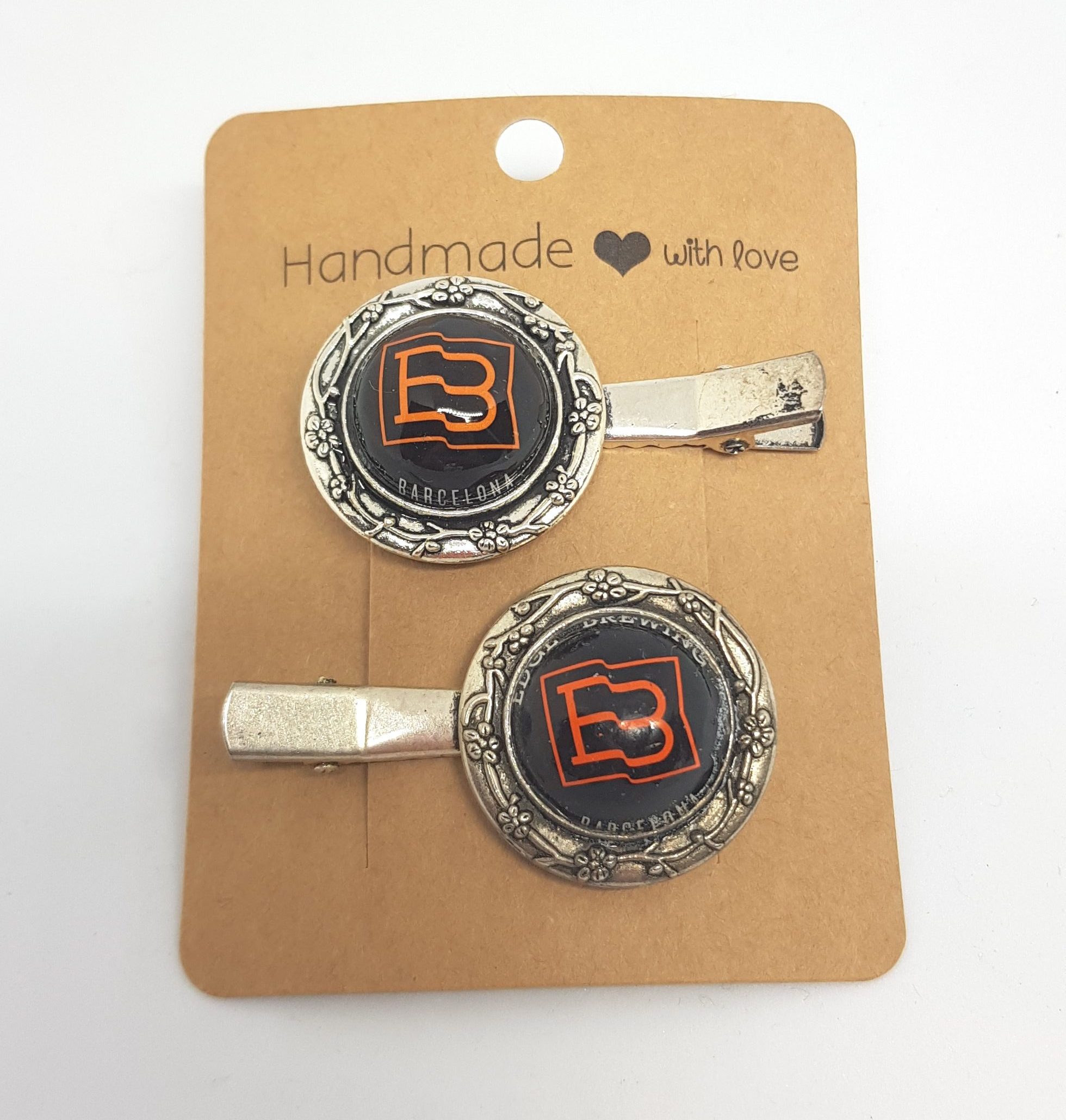 Набор из 2 заколок для волос, украшенных значками крафтового пива Edge Brewing. Покройте лаком, чтобы детали блестели и не царапались.