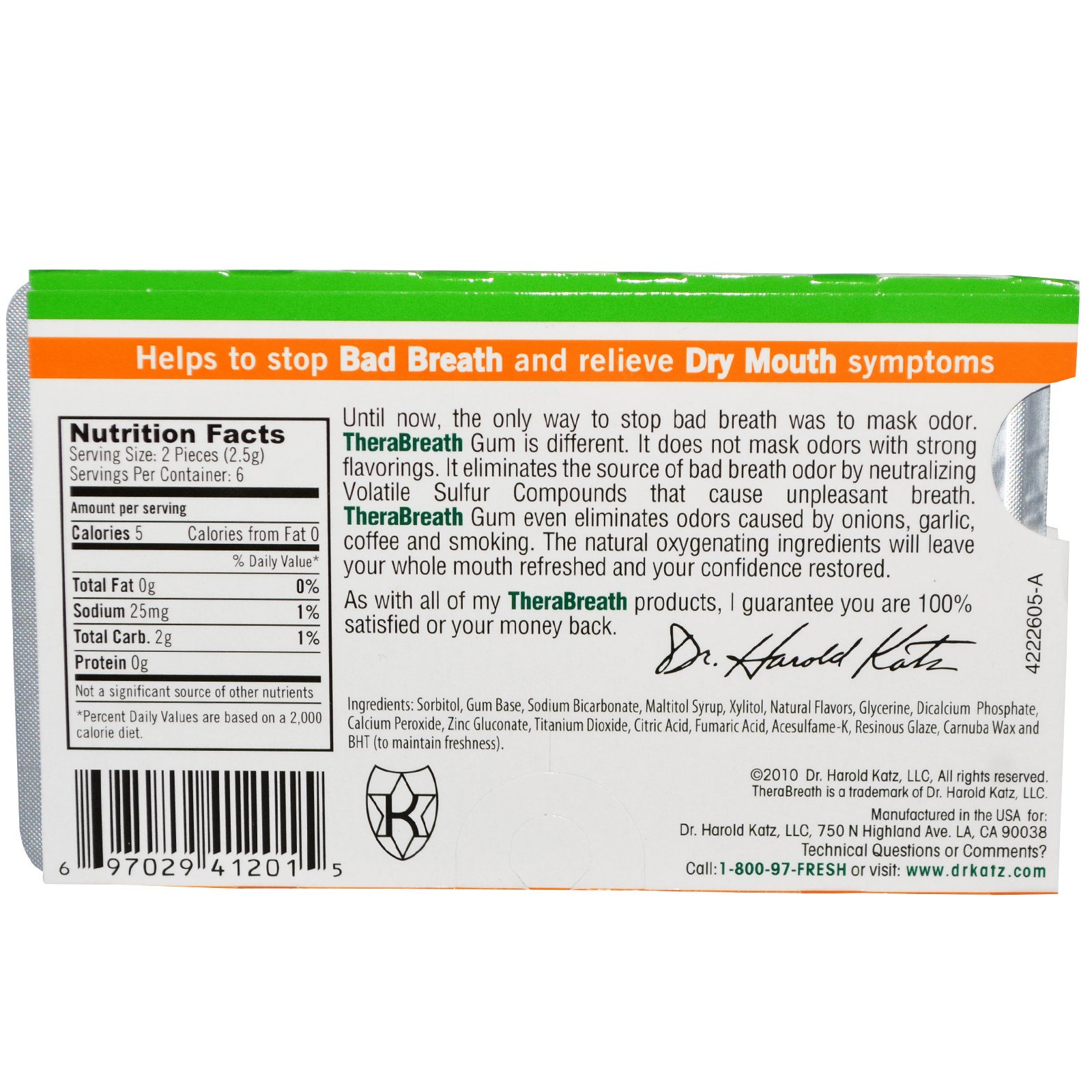 До недавнего времени единственной причиной избавиться от неприятного запаха было замаскировать его. Жевательная резинка TheraBreath действует иначе. Она не маскирует запах с помощью сильных ароматизирующих веществ. Она устраняет причину неприятного запаха, нейтрализуя соединения летучей серы, которые и вызывают его появление. Жевательная резинка TheraBreath даже устраняет запах лука, чеснока, кофе и сигарет. Натуральные ингредиенты, насыщенные кислородом, освежают полость рта и возвращают вам уверенность в своем дыхании.