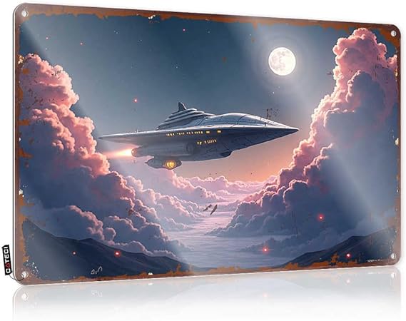 FZFN Little Man Cave-Schild, Alien-Raumschiff, das durch den bewölkten Nachthimmel fliegt, mit Vollmond-Blechschild, Vintage-Metallschilder, lustige Metall-Bierschilder (30 x 40 cm)