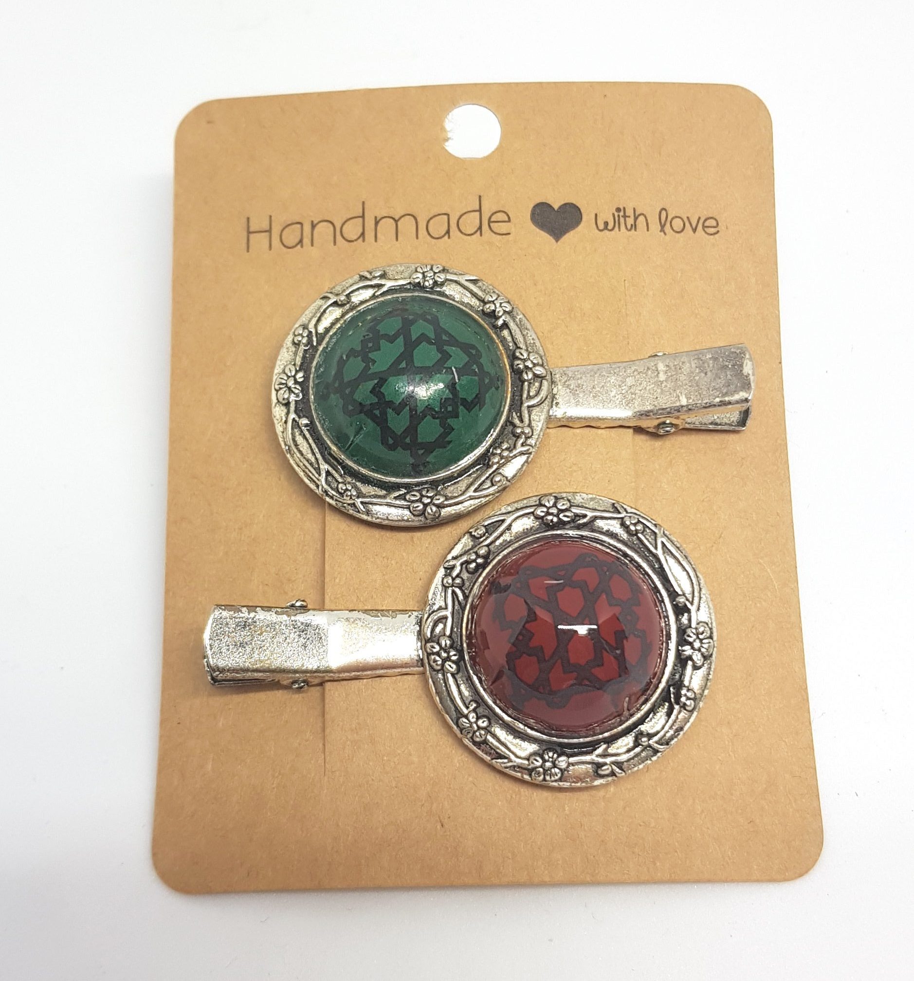 Набор из 2 заколок для волос, изготовленных вручную с использованием пивных листов Alhambra. Яркая и кристальная отделка, выполненная смесью лаков, благодаря чему изделие блестит и не царапается. Таким образом, он прослужит вечно, не потеряв рисунок листового металла.